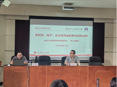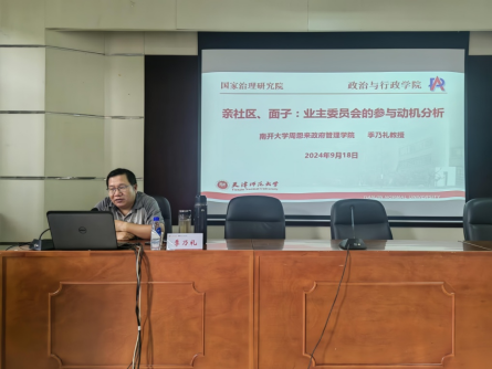 2024年9月18日,南开大学周恩来政府管理学院教授、博士生导师季乃礼为必赢76net线路官网的师生们带来了一场题为《亲社区、面子:业主委员会的参与动机分析》的精彩讲座。本场讲座由必赢76net线路官网刘学斌教授主持,70余名硕博士研究生及青年教师聆听了讲座。