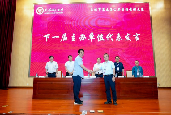 最后,天津市公共管理案例大赛进行了举办单位交接仪式,天津市第六届公共管理案例大赛主办单位代表、河北工业大学人文与法律学院副院长闫文博教授发言,他对本届大赛的圆满举办表示祝贺,并介绍了下一届赛事的筹备设想,欢迎各高校师生继续关注与参与,共同推动公共管理案例教育教学活动的深入开展。