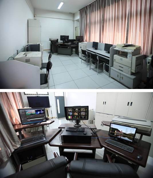 多媒体中心位于主校区兴文楼B423,使用面积30m2,本实验室有高标清多功能编辑系统、数字摄录一体机、网络摄像头、彩色激光打印机、另有计算机多台。可供学院各专业师生进行音视频信息采集、后期编辑制作。