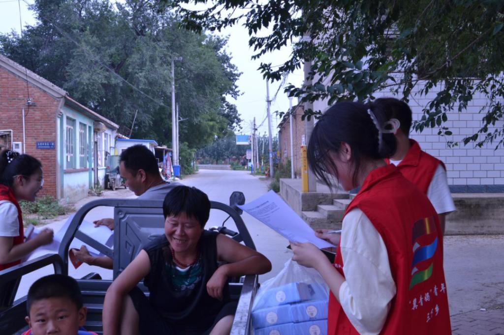 在与工作人员简单交流过后,“冀青妈”普法青年团开始了入村后的第一项工作,这也是他们与村民之间的破冰行动——入户。“冀青妈”普法青年团一行人身着整齐的红马甲,兴致冲冲地走出了村委会,走入了村庄。在桥头、在小巷、在河边、在房门口……他们与不同的老人进行了交流,帮助老人做些力所能及的小事,唠唠家常,拉近与当地村民的距离。同时,“冀青妈”普法青年团的普法团队还向老人们发放了问卷,简单了解了老人们生活中学法、知法、用法的相关情况,以便为后面几天的普法讲座、普法百家行、街头普法宣讲、反诈骗宣传等活动做准备。