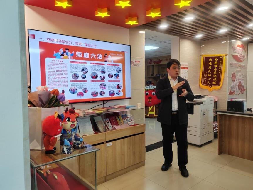 学院考察组首先来到佳和荣庭党群服务中心调研学习,在社区书记、居委会主任门万成的带领下,实地参观了社区居民会客厅、苏伯伯合和社、墨香文创社和“红色工坊”等地,详细了解了“荣庭六法”“抱团养老”“银发志愿队”等特色社区治理模式和工作方法。