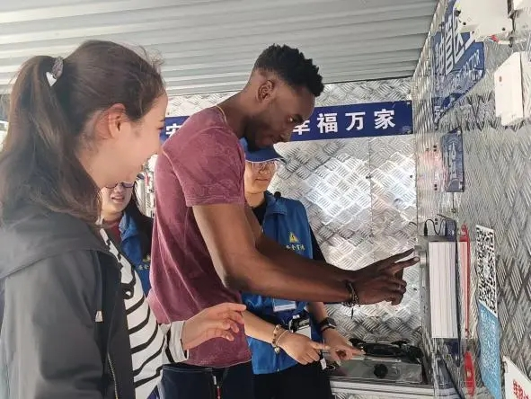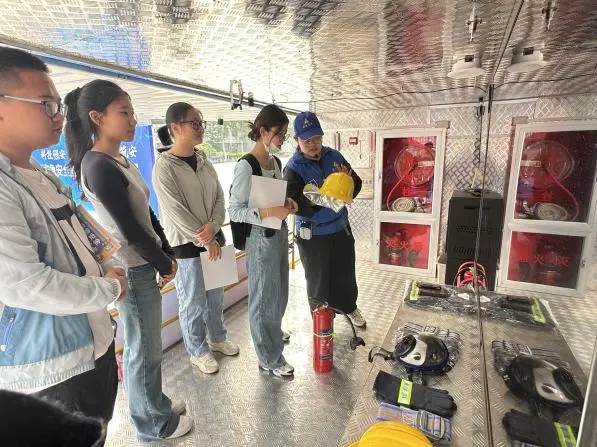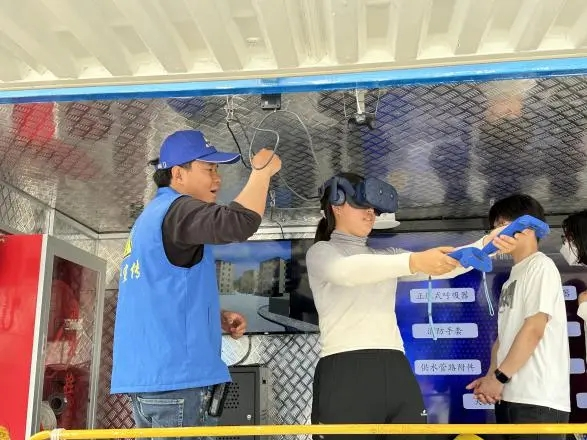 “应急安全宣传大篷车”依托先进技术,通过图文、影音、AI+VR互动等多媒体形式,设计了消防、用电、烟雾逃生、地震模拟灯主题应急科普模块,实现了科学性、知识性、趣味性于一体的应急安全知识科普。活动现场共设置了4辆大篷车,主题分别是消防安全、用电安全、烟雾模拟逃生、移动式VR地震体验,还设置了5个移动点位为同学们讲解心肺复苏、应急包配置使用以及国防安全等方面的应急安全专业知识。