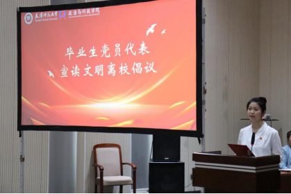 天津市优秀共青团员甄鑫作为毕业生党员代表向全体党员发出文明离校倡议,号召全体毕业生党员锤炼党性修养,秉持师大校训,彰显青年担当,带动全体学生为实现社会主义现代化强国贡献自己的力量。